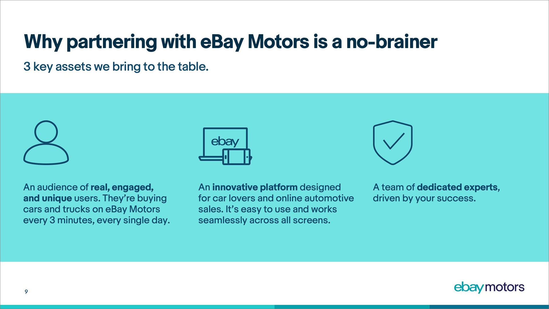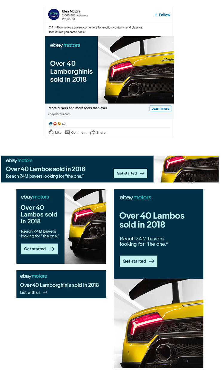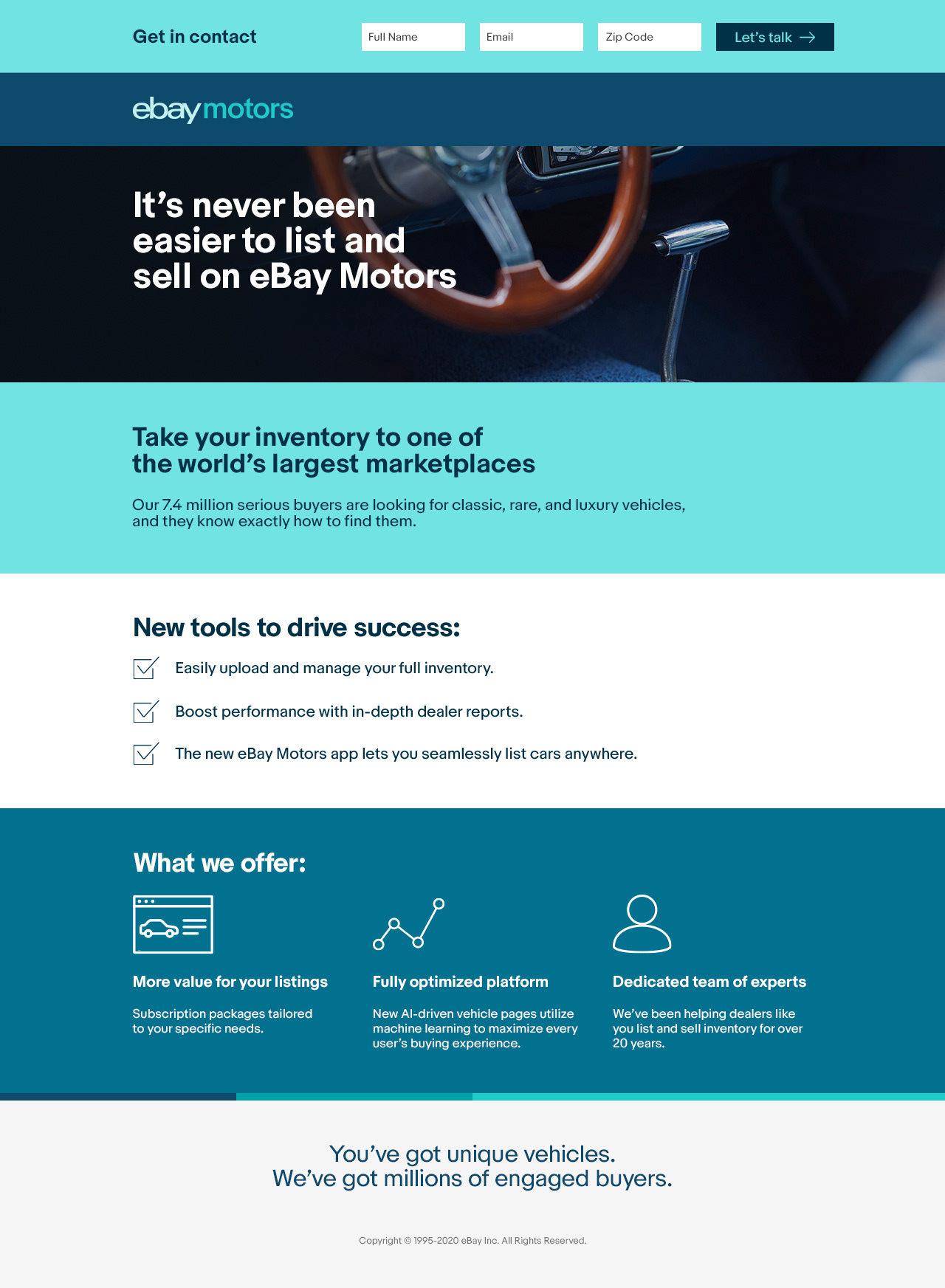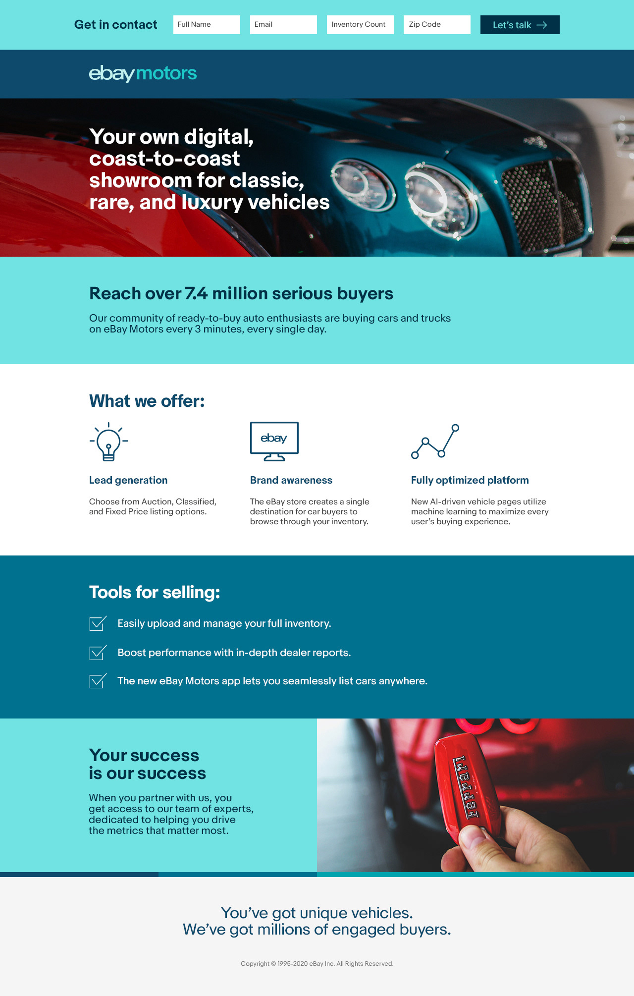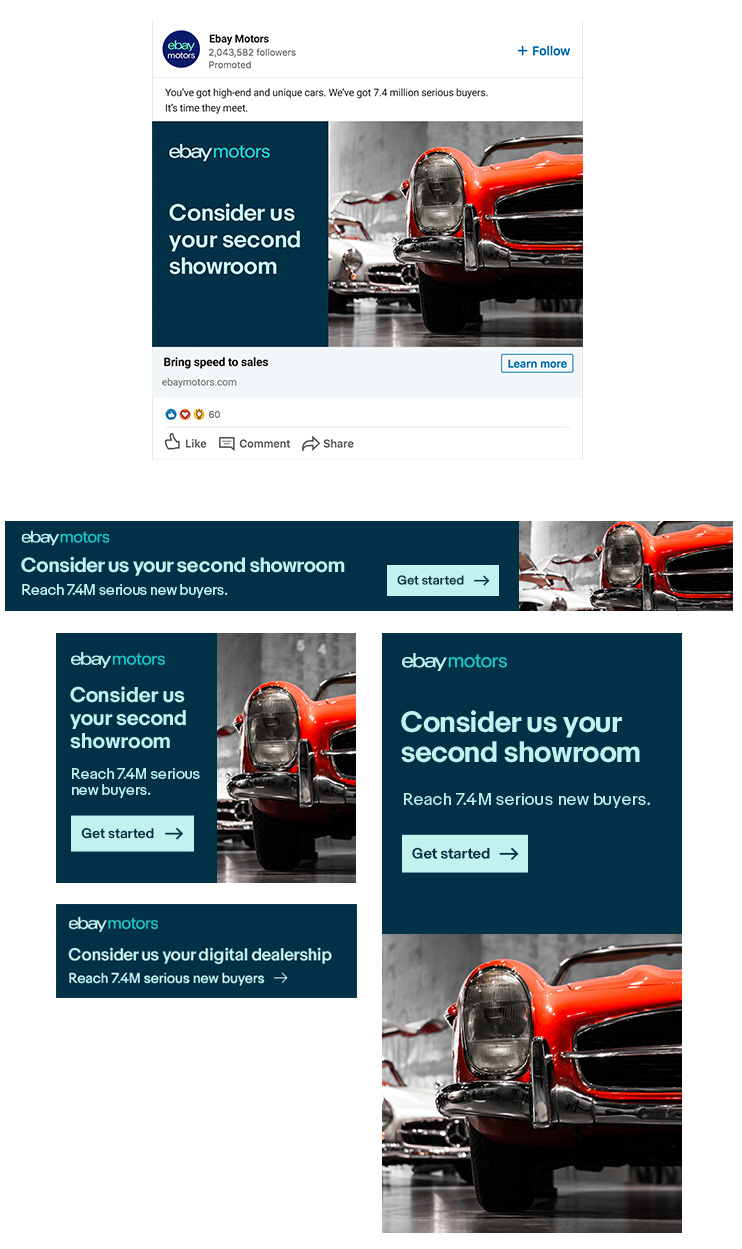Our team provided strategy, design, copy, and creative direction in support of the always-on B2B digital campaign for eBay Motors targeting dealerships who specialize in high-end, custom and classic cars. Primary objectives included brand awareness, presence across target trade publications, lead generation, and capture. Additionally, our team created a deck that would inspire and instill confidence in the sales team while presenting.