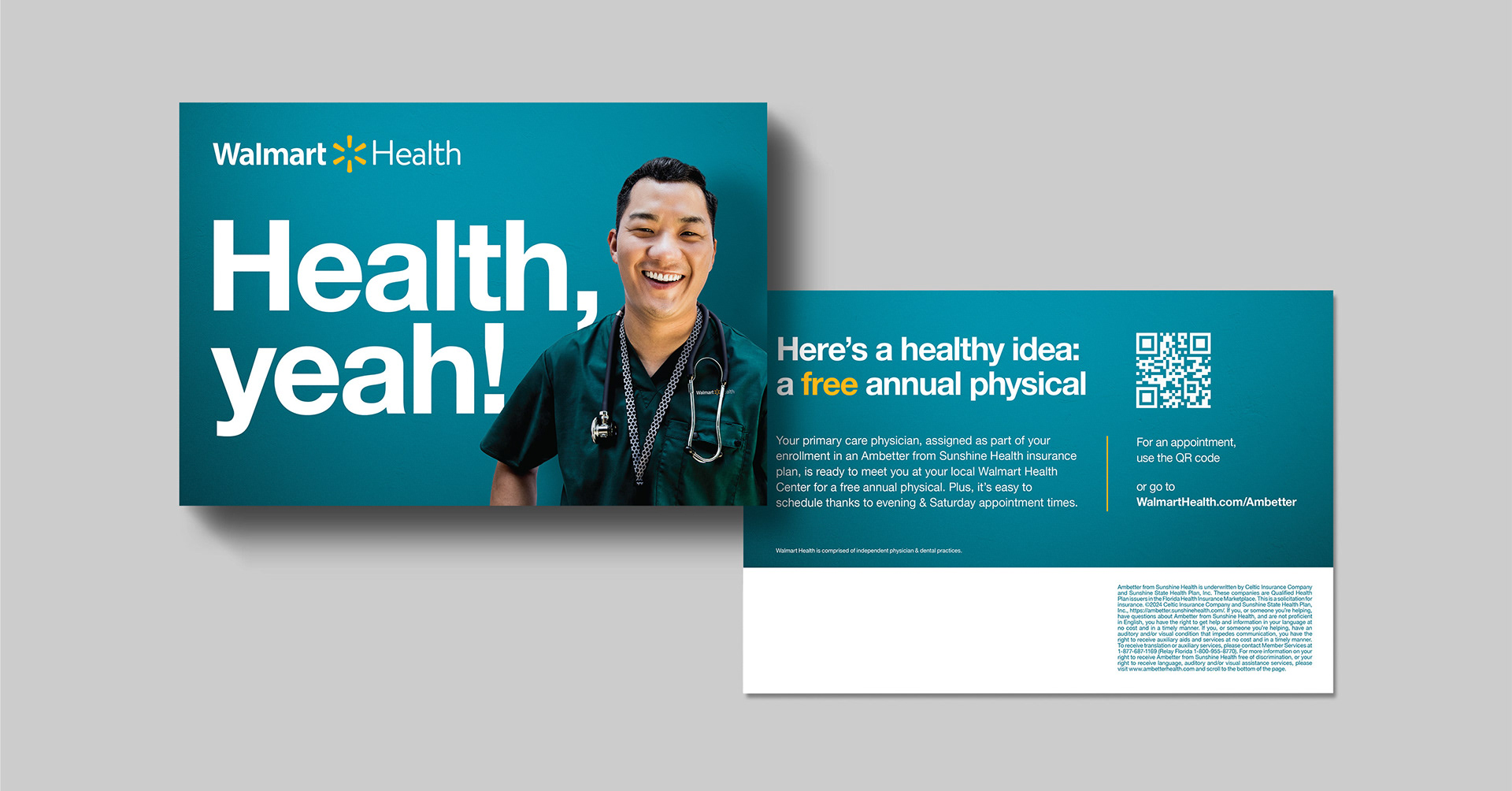 Walmart Health Centers delivered primary care health services to communities in 5 states. Our internal team reimagined the Walmart Health campaign, bringing the upper funnel awareness work in-house for the first time. Bold visuals and pithy copy helped lead the way to an increase in awareness, appointments scheduled and ROI. 2024 / banner ads, social, OOH, direct mail, print, radio